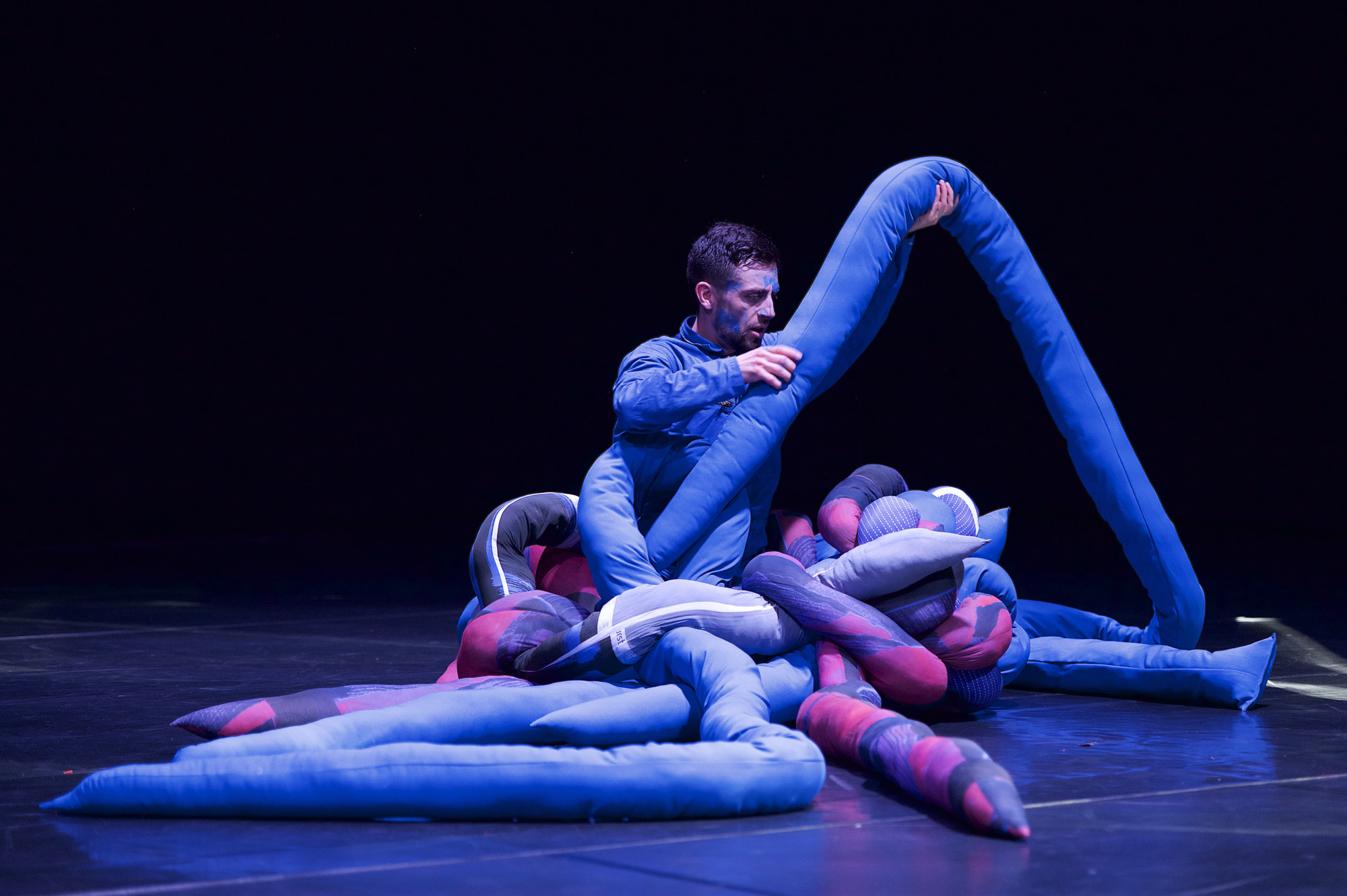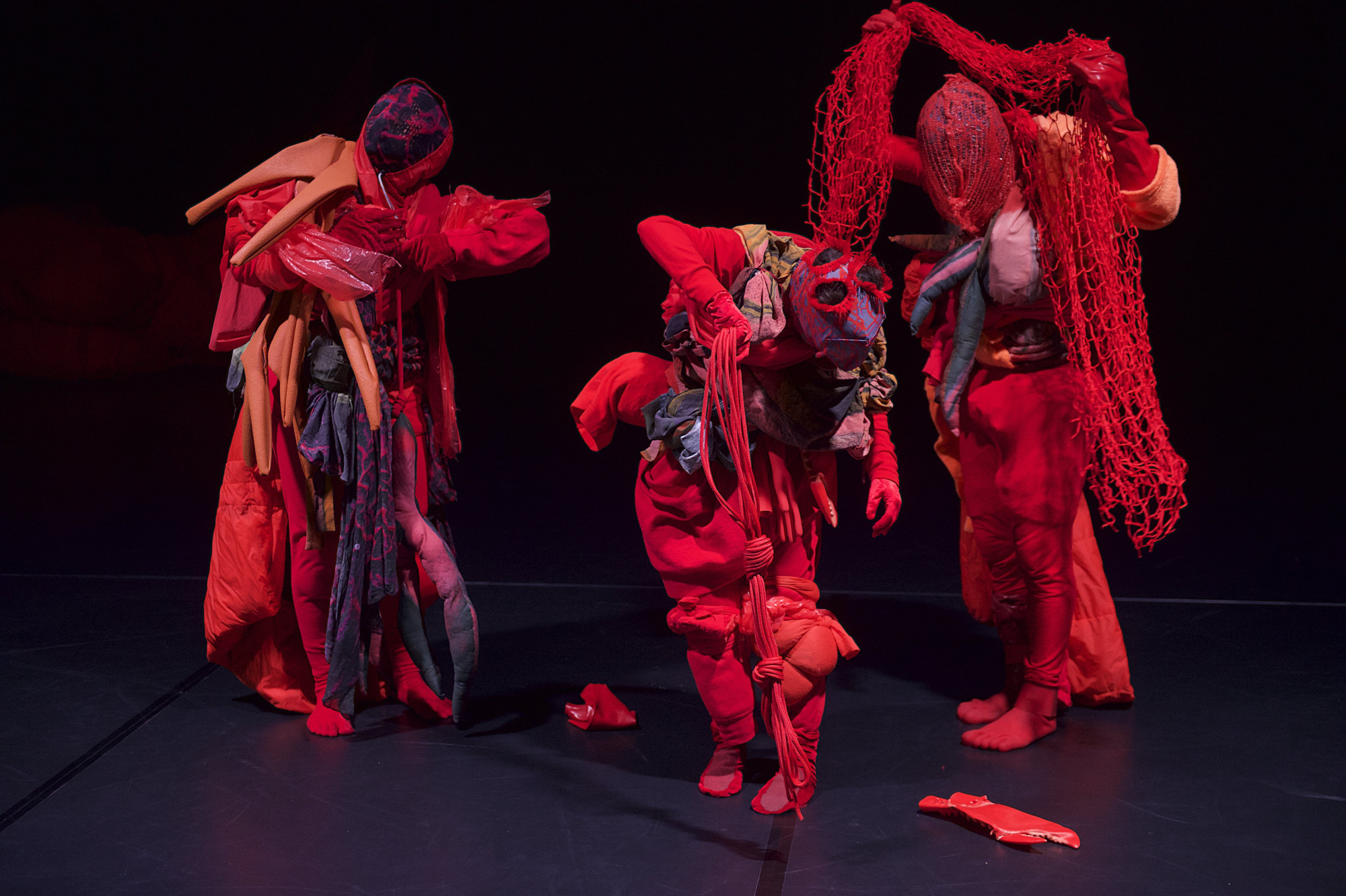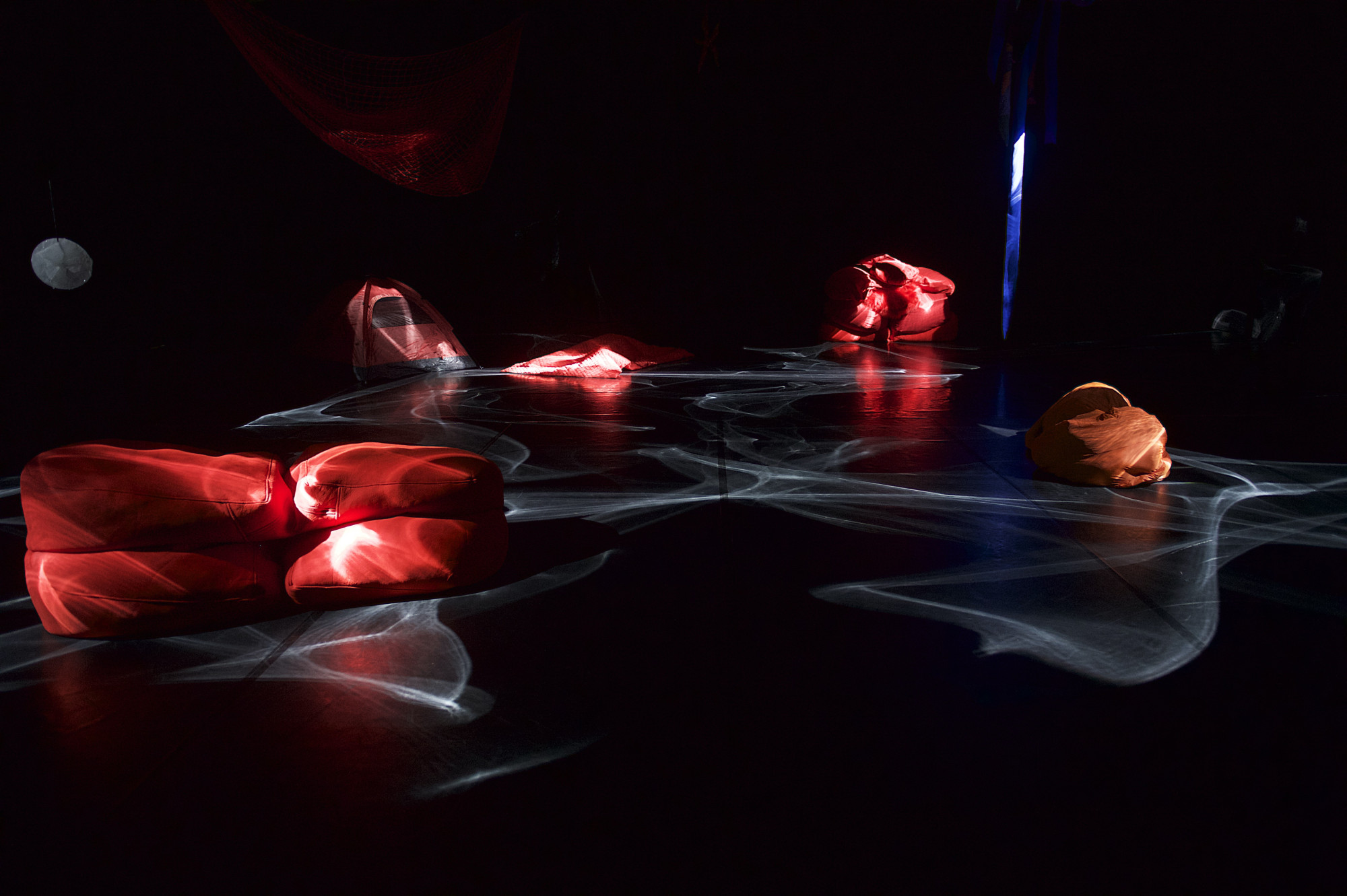 Tentacles dangling from the ceiling, life-sized fabric caterpillars, a bouncing tent, heaps towering and teetering on top of each other and ice melting. All Our Eyes Believe reflects on ecosystems in the air, on land and under water. A constantly changing landscape emerges before our eyes, one that breathes and pulsates, grows and vibrates. While the stage lights call for gloomy weather and the sound gets caught in a peculiarly silent underwater world, three creatures follow their curiosity and creep ashore. As they wonder at and take care of their environment, they move into and over one another, becoming ever more entangled. At the end of the piece, the three performers open up their world to the audience and allow the landscape to continue to grow.