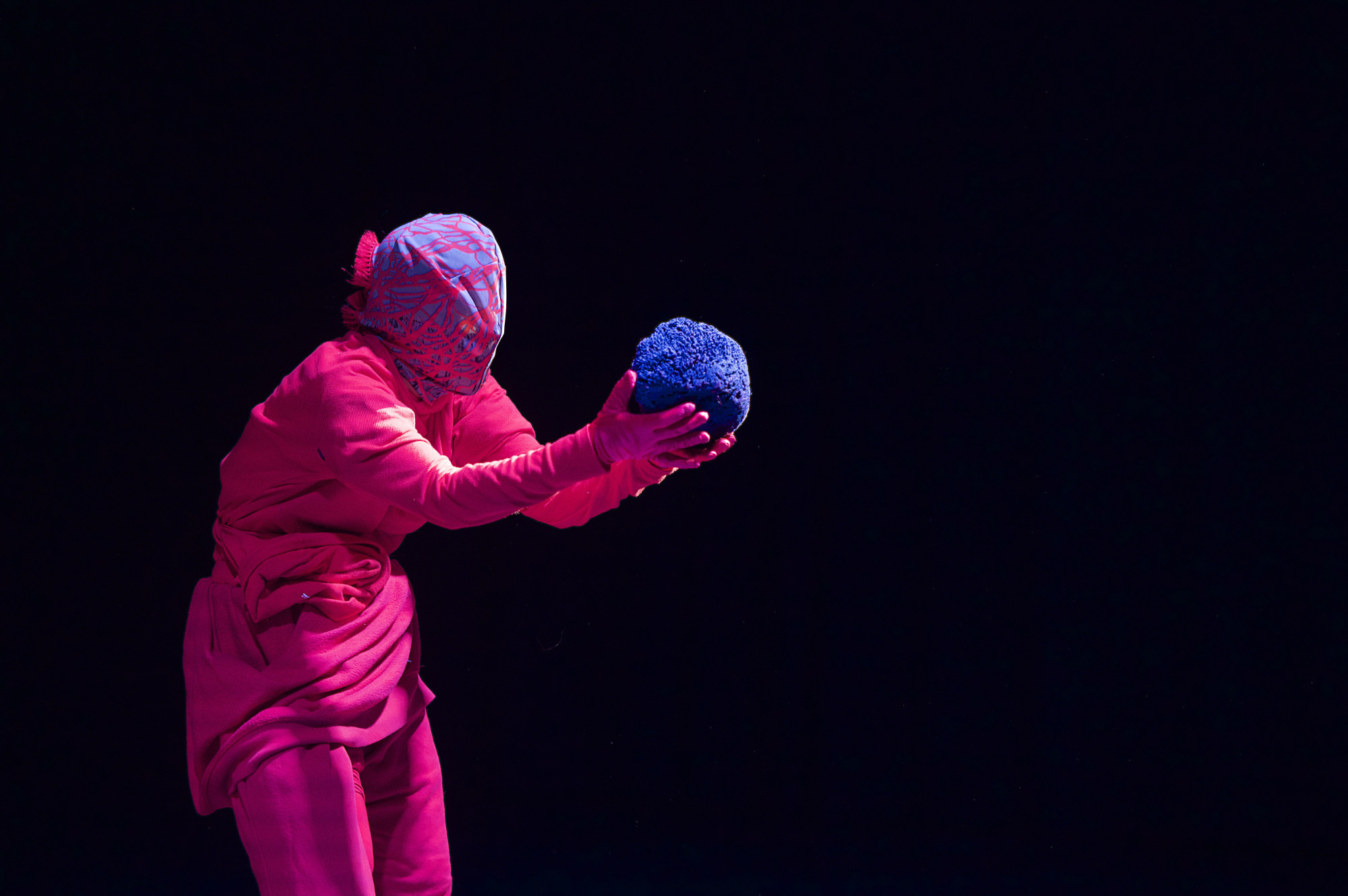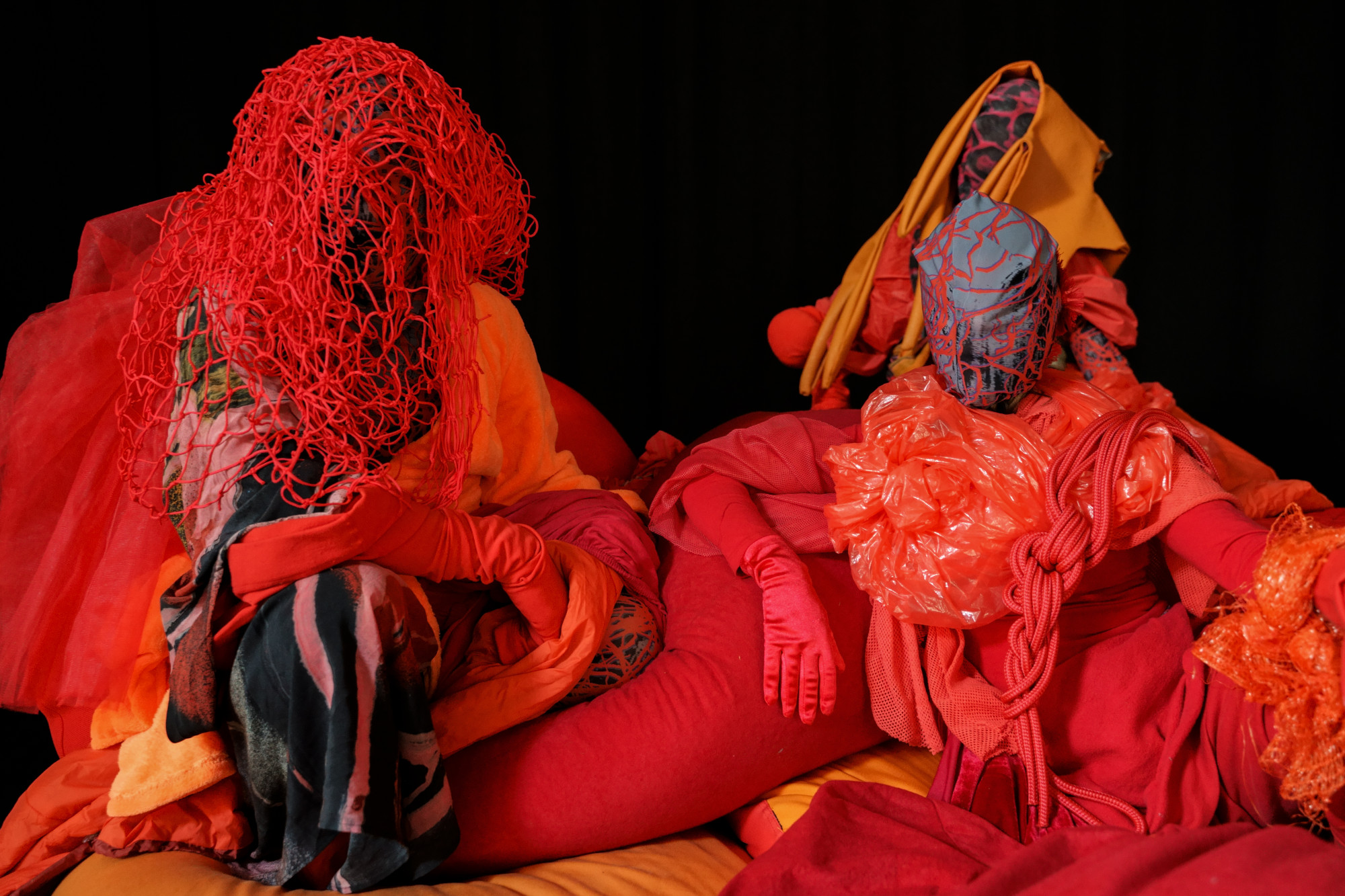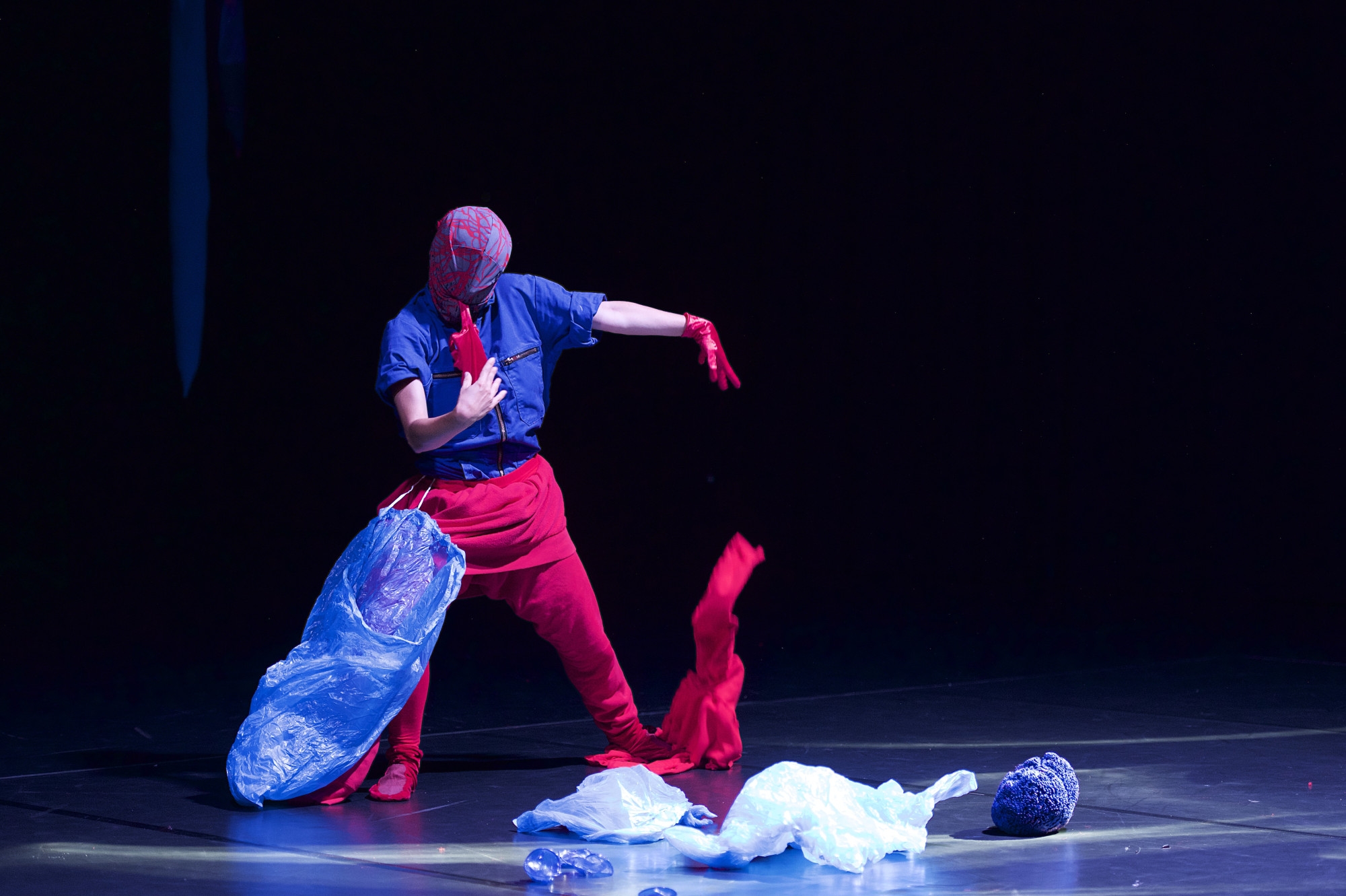 Tentacles dangling from the ceiling, life-sized fabric caterpillars, a bouncing tent, heaps towering and teetering on top of each other and ice melting. All Our Eyes Believe reflects on ecosystems in the air, on land and under water. A constantly changing landscape emerges before our eyes, one that breathes and pulsates, grows and vibrates. While the stage lights call for gloomy weather and the sound gets caught in a peculiarly silent underwater world, three creatures follow their curiosity and creep ashore. As they wonder at and take care of their environment, they move into and over one another, becoming ever more entangled. At the end of the piece, the three performers open up their world to the audience and allow the landscape to continue to grow.