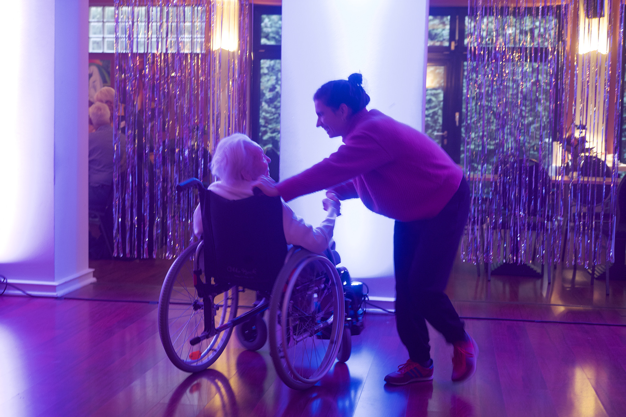 Under the title Sketch of Togetherness - goes ballroom, Lea Moro, together with the dramaturge Alexandra Henning and the sound artist / DJ Andres Bucci, invited elderly people to a collective dance on 4th December 2019. By re-sensitising the body, the ball participants, many regulars among them, were invited to rediscover their own bodies and the joy of dancing. In this way an atmosphere of trust and flat hierarchy was built between people of different ages, experiences and physical condition, who had not met before. Rehearsed elements from Sketch of Togetherness were transferred to a completely new context and put to the test. Through inclusive warm-ups, exercises for body awareness and mobilisation; simple movement sequences and solo dancing to music, the participants got to know more about themselves and one another. Dancing together also meant learning from one another. We challenged each other to dance, watched one another, created new dance moves, cheered each other on, allowed for breaks, swayed to our favourite songs and shared life stories – almost in passing. By applying makeup to one another, we exposed ourselves to one another, trusting our ability to transform. On the dance floor, chatting over coffee and cake and outside the group, we discovered moments of togetherness, reminding us that we can come together, whatever time it is, wherever we are and however old we are.