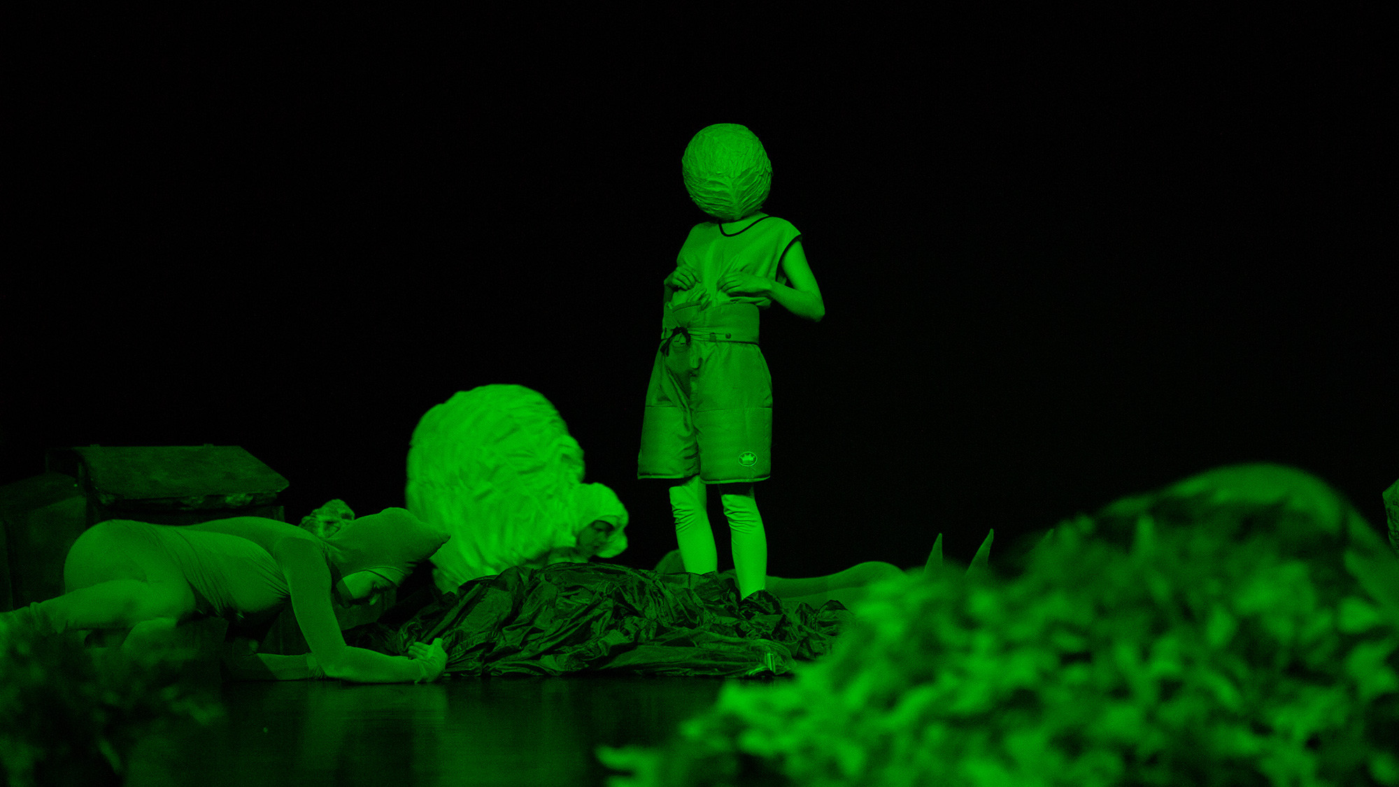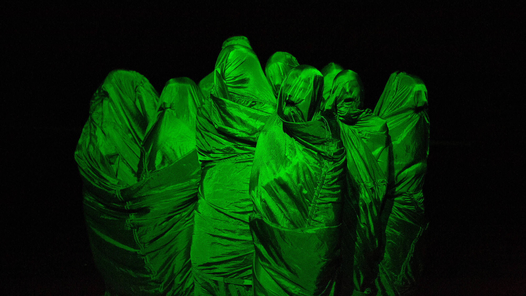 In a gloomy green space, nine performers explore and reconsider modes of bodily existence. The boundaries of their limbs, lungs, and legs are blurred, becoming a part of the universe they inhabit and which inhabits them.