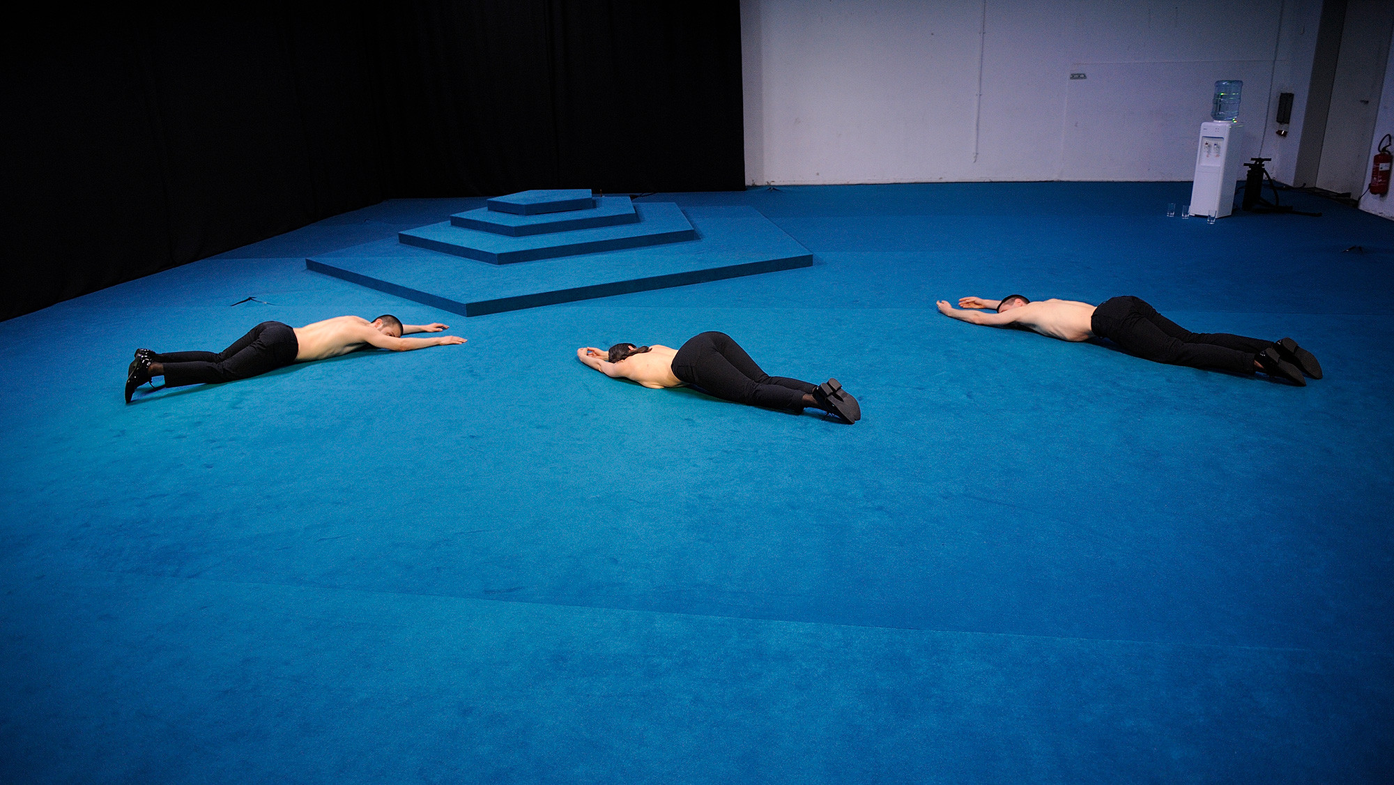 Drei liegende Körper zeigen sich scheinbar unbewegt auf blauem Grund. In (b)reaching stillness wird Stillstand als stetige Veränderung betrachtet und auf sein physisches Potential hin befragt. Ausgangspunkt bilden barocke Stillleben – nicht nur aufgrund ihrer offensichtlichen Eigenschaft der Stillstallung – sondern vor allem wegen ihrer Fähigkeit der "Verlebendigung" von toten oder unbelegten Motiven. Aus der monochromen Fläche emporstrebend, schieben sich glamouröse Höhepunkte vor erneutes Niedersinken.